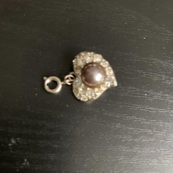 Lovely little silver-toned bracelet dangle charm with pave crystals and gray faux pearl. Has a secure spring-ring clasp. Unbranded. Very pretty on both sides. D1450