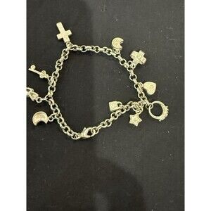 Beautiful boho-style approximate 7 silver-tone charm bracelet featuring meaningful symbols of faith and inspiration including a cross, crescent moon, heart, star, key, and circle. Each charm has subtle texture and sparkle, giving the piece an artisan, spiritual look that complements both casual and dressy styles.