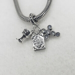Sterling Silver S 925 Dangle Holy Bible Pandora Style Bracelet Charm Bible Cross Chalice Zirconia Details