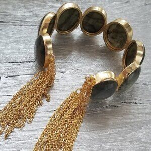 This Handcrafted cuff bracelet features, stunning handcut semiprecious Labradorite stones embedded in recycled brass coated with dangling chain details to create a stunning look! Dainty