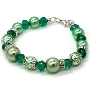 Bracelet Green Pearls Green Crystals Rhinestones Bead Caps Silver Lobster Clasp