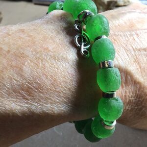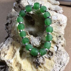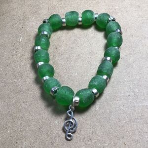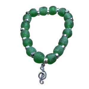 Handmade African Beaded Bracelet, NEW, Stretch, Green. This pretty stackable bracelet is comfortable to wear. The beads are hand made in Africa. Molten glass is poured into a fine sand mold to shape the beads, giving them there unique matte finish. The beads are interspersed with silvery pewter beads and strung on 3 strands of elastic. An treble clef charm dangles from the bracelet. New from my Florida studio. Made in the USA.