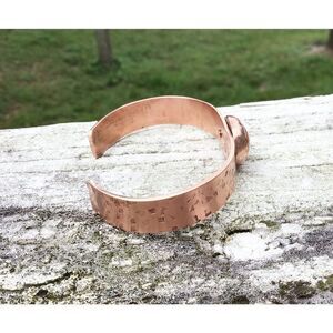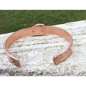 Hand wrought copper cuff is embellished with Coral and White Agate mined in Germany. The setting is made from roofing shingle. Only 1/2” wide, this is perfect to wear alone or stacked with your watch or over loved bracelets. This is adjustable from 6.5” to 7” wrists. If you need it smaller, just let me know before shipping and I will adjust it at no charge. A polishing pad is included. New from my studio.