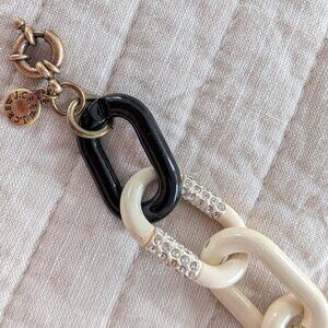 This is a neat J Crew bracelet in black and white plastic bedazzled with faux diamonds. Worn once and in great condition it is fun to add to your outfit.