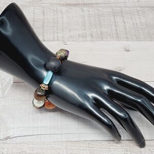 Memory wire bracelet made with natural stone, glass, wood and acrylic beads of varying color.
