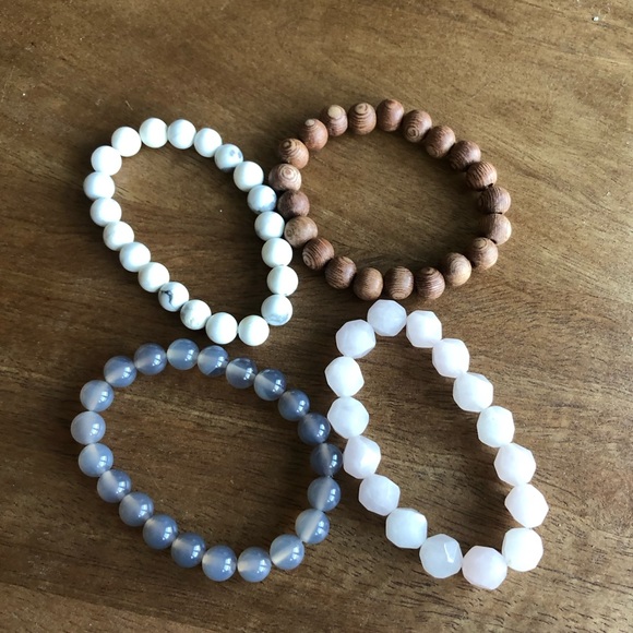 Set of 4 artisan bracelets. One is a marble color, one is a wooden bead, one is an iridescent pink, and the other is a gray color. Will not sell separately. Must buy set. These were purchased from an artist on Etsy. Come from a smoke free home. Comment with questions or make me an offer!