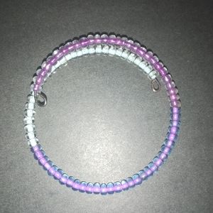 Three handmade memory wire bracelets beaded with seed beads Each one is beaded differently All have silver toned metal wire