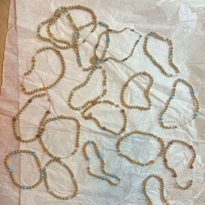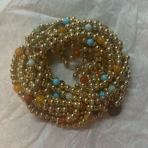 Colorful stack of gold beaded bracelets with mixed in colors and a small charm that says "wish".