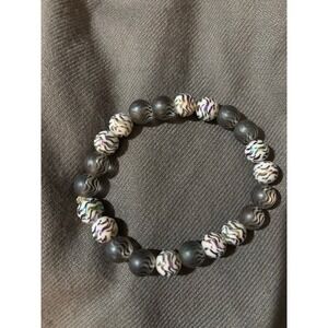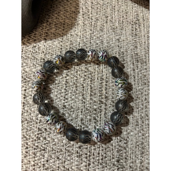 This is a beaded stretch bracelet featuring matte gray wave-patterned beads and colorful speckled white beads