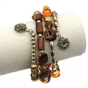 Bracelet Three Strands Brown & Amber beads. Gold Charms. OS.