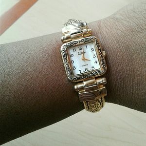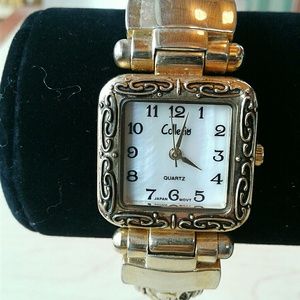 Gold bracelet watch with mother of pearl in center of watch. Both sides opens to allow room to put on your wrist. Needs new battery.