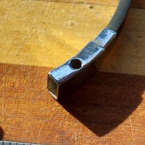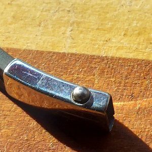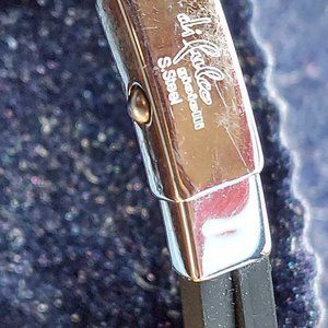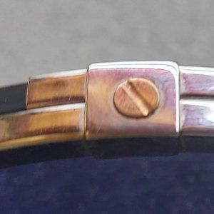 For your consideration a duel rubber black band encased with stainless steel rectangular chrome cuffs and with a dalip of gold brushed on the slot screw head of the top of the piece. This was designed for outdoor excursions and with minimal discomfort. In or out of the water with heavy chromium content stainless steel. Artisan made from house "di fulco" Gioielli and purchase at Stroili Oro in Perugia, Italy some time ago. Stretched out it measures 8 3/8 inches. Please refer to the pictures for details and contact me for more pictures or question regarding said bracelet.