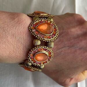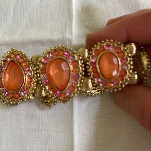 Bracelet, pink and orange stones with gold tone framing, double elastic hold, preowned but great condition.