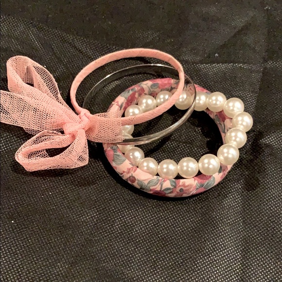 Bracelet stack, pink, silver, floral and pearls