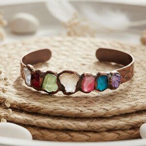 Elevate your boho style with this stunning vintage copper cuff bracelet, meticulously handcrafted with a unique burnt welded design. Featuring seven natural gemstones, each with its own vibrant hue, this multi-colored rock crystal bracelet is a true statement piece. Perfect for those who love earthy, eclectic jewelry with a touch of mystique. Wear it solo or stack it with other bracelets for a layered look. Ideal for festival fashion or adding a pop of color to any outfit! 🌟