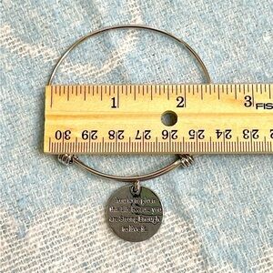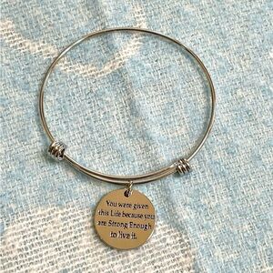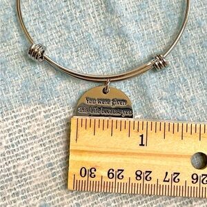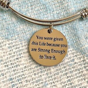 This silver tone bracelet is expandable, but best suited for a small or medium sized wrist. The charm says, “You were given this life because you are strong enough to live it.” This bracelet is giftable or perfect to keep for yourself.