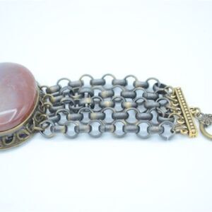Unique 5-chain linked bracelet with large central set natural cabochon gemstone with felt backing, decorative end caps and toggle closure.