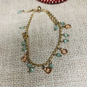 Vegan leather gold stud 7.5 in, Red silver tone bead adjustable, Goldtone blue and pink crystal adjustable
