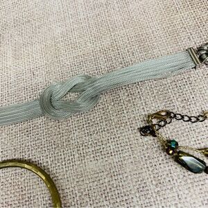 Goldtone cuff, Silvertone Knot 7.25 in, Smoky Glass beaded Goldtone 10 in.