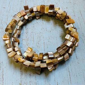 Stretch blue crystal faux pearl eye, Silvertone yellow green crystal stretch, gray clear crackle glass adjustable, shell chip memory wire