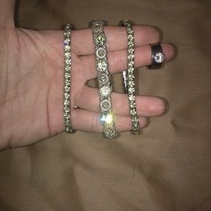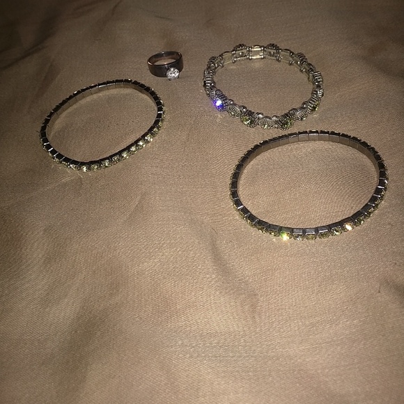 3 bracelets that have a green tint to them and a ring that needs to be polished. Very pretty and eye catching when worn!