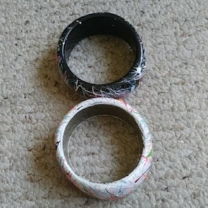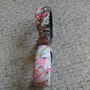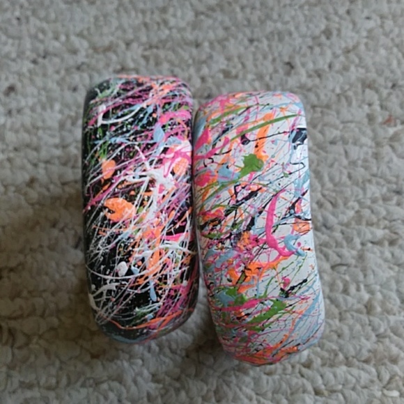 I made these myself. It's a clear bracelet with white and black paint and a splat design