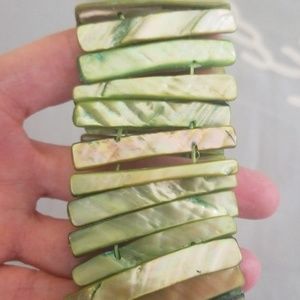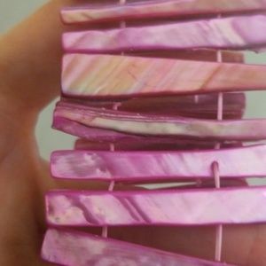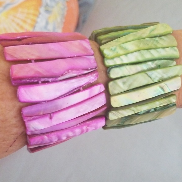 Pink and green colored mother of pearl bracelets. Stretch. Purple has one broken shell. Price is for all 3.