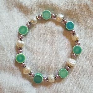 Hand beaded bracelets made from ceramic, glass, metal and faux Pearl. One of a kind that measure approximately 7.5 in around.