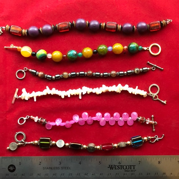 Lot of 6 bracelets acrylic, mother pearl, wooden and metallic with Tiffany style clasps and one latching clasp.