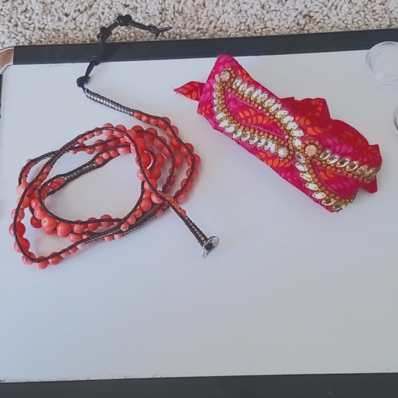 Never worn 1: wrap bracelet with red/orange beads 2: anthropologie fabric bracelet with beading- pink and orange