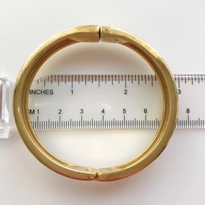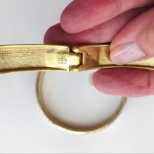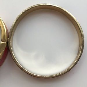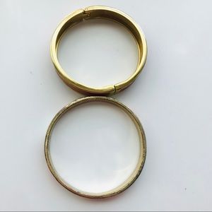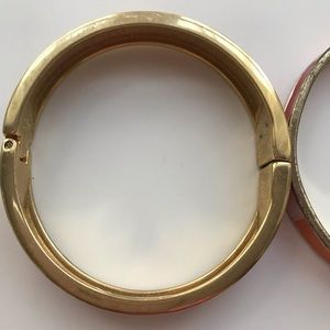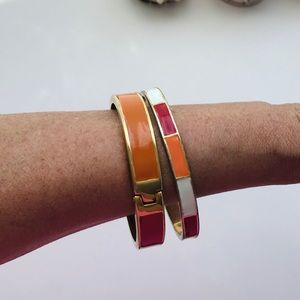 One Banana Republic and one unnamed bracelet. Both slightly used but in good condition. Some scratches on the edge as seen in photos. Bracelet on the left has a magnetic closure and is two shades of orange. Bracelet on the right is a bangle and is two shades of orange and white.