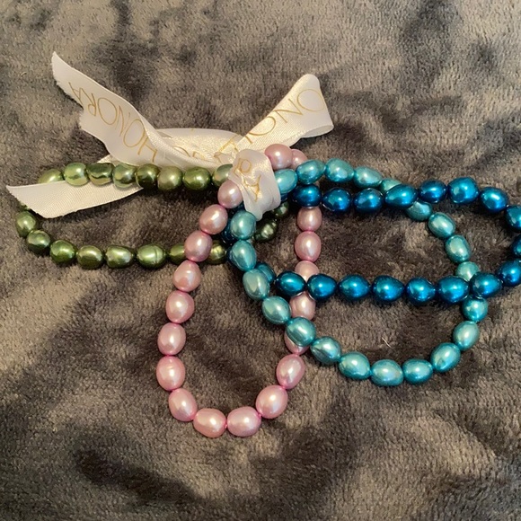 Handmade elasticize pearl beaded bracelets. Dark aqua blue silver/pink, light green & light aqua. This is an excellent present for a young girl.