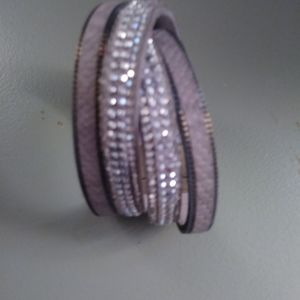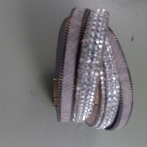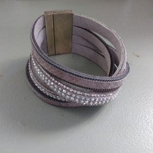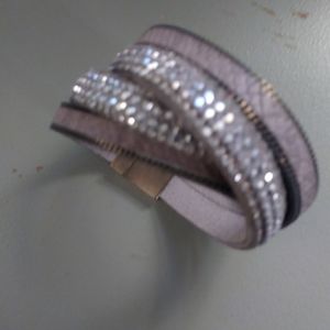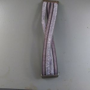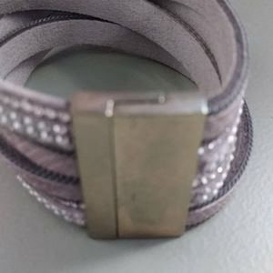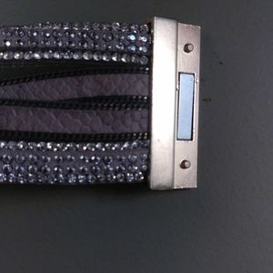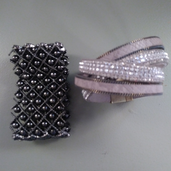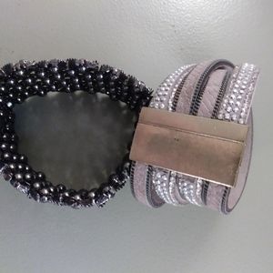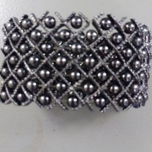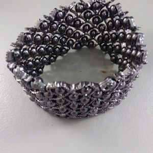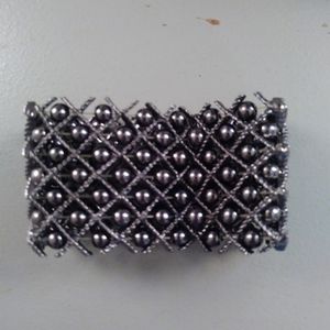 Black beaded cuff bracelet. Taupe and silver accents bracket. Gold magnetic clasp closure. Some tarnish on clasp (see last photo).