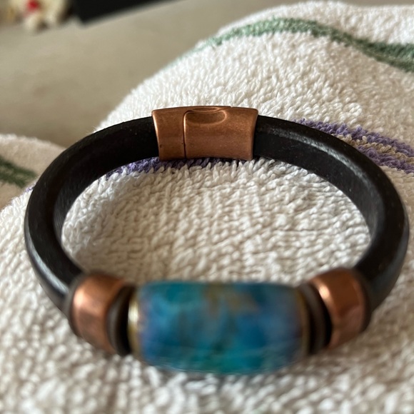 3 very cute bracelets….brown leather and copper tone with copper snap. One with white stone…one aqua stone and one multi stone. Very comfy to wear. Great dressed up or with jeans. $30.00 each.
