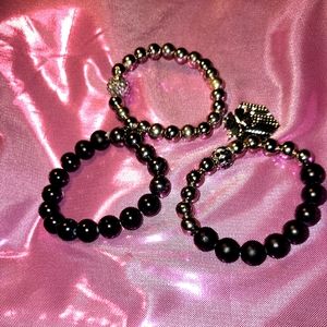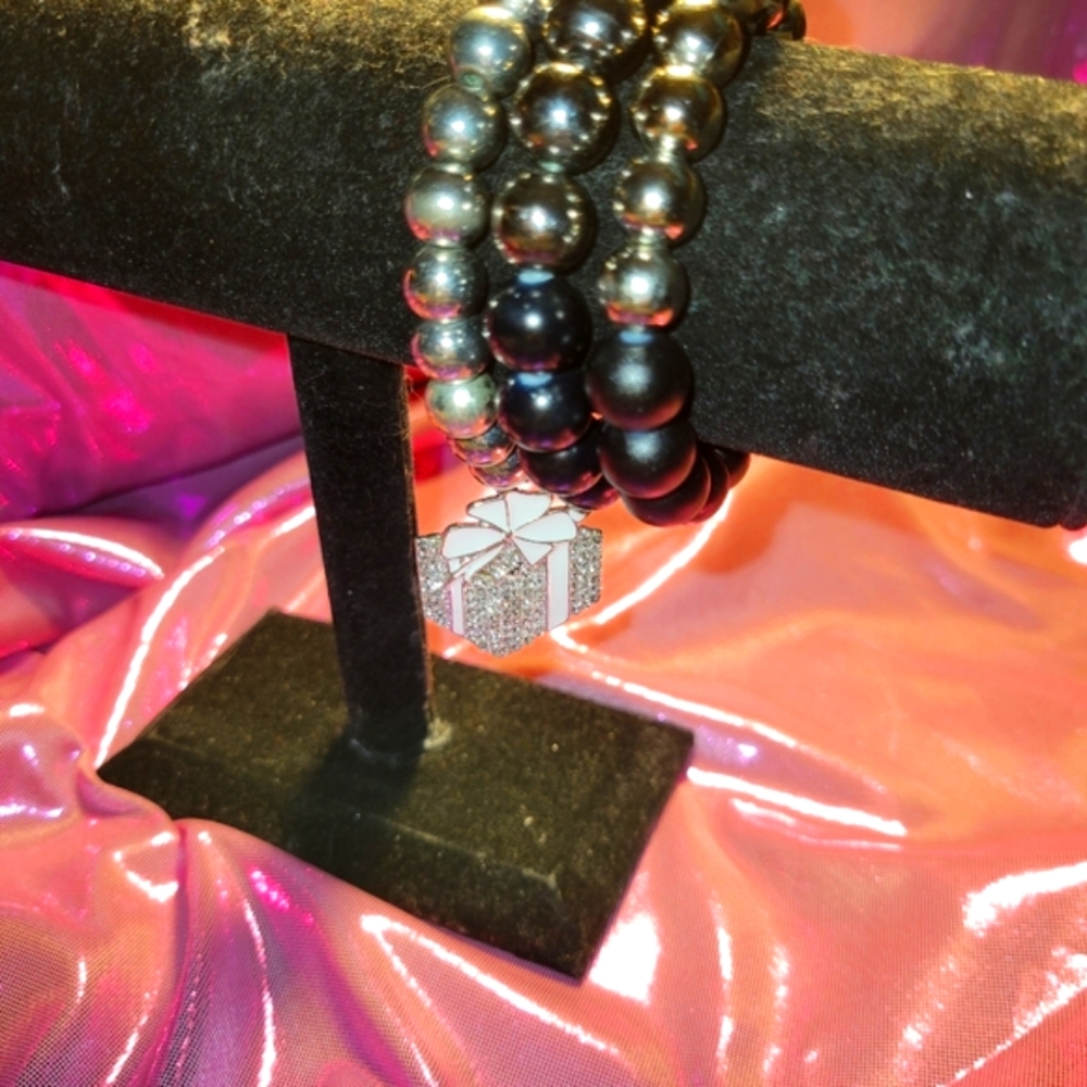 one of a kind beaded bracelet, set of 3, black and silver, one with gift box dangle charm