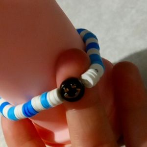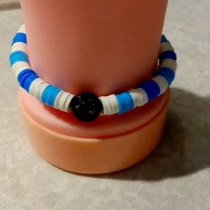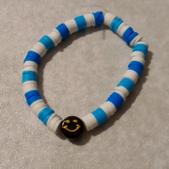 This bracelet is a very stretchy.It is called blueberry blist because of the colors in it and I love the touch the the smiley face gives it.I hope you enjoy this bracelet.