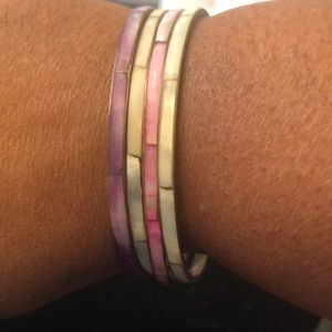 Abalone Mother of Pearl Inlay Bangle Bracelets. The Colors are Purple, 2 Green, and one Fuchsia. The finish is either brass or bronze.