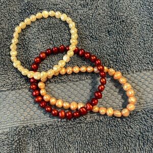 Three bracelets that are stretchable. Very good condition. Bubblegum Pink, Pearl White, and Christmas Red