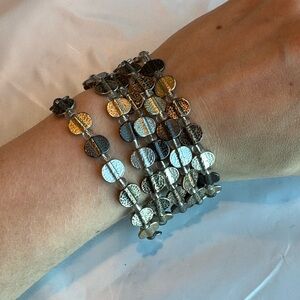5 bracelets with gold and silver colored medallions.