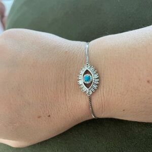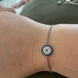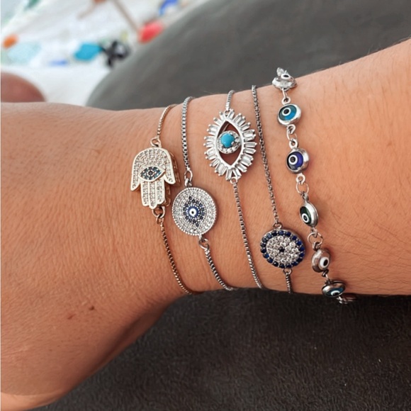 Elegant silver bracelet set featuring blue evil eye charms. Perfect for adding a touch of protection and style to any outfit.