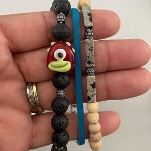 New Unisex handmade monster adjustable bracelets,with lava stones,dalmatian jasper,wood,brass spacers,blue leather,and beautiful lampwork monster,accept offers,free gift with each purchase,same day shipping.