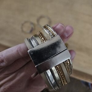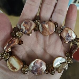 set of five bracelets, one silver with colorful small beading, one weaved fabric adjustable bracelet, one beautiful brown/shiny pealesque beads and stone stretch bracelet, one silver with turquoise and diamond looking stones that stretches and one leather/rope and diamond looking strands with magnetic clasp
