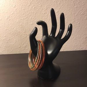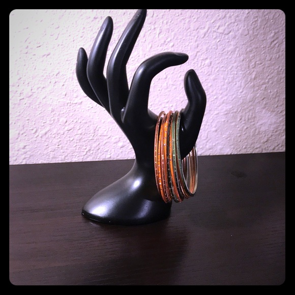 Brown. Orange. Green. Gold. Bangles. Layered bracelets.