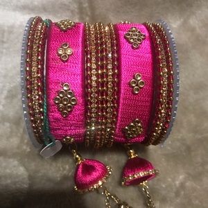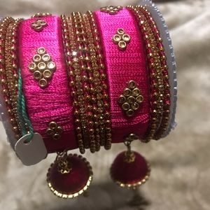 Beautiful hot pink silk thread bangles with dangling bells , gold and pink combination is breathtaking .