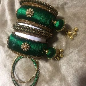 Beautiful gold and green silk thread handmade bangles with dangling charms.
