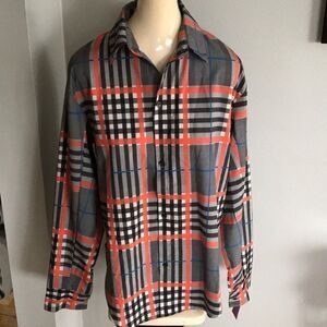 Brach Brach black, blue and red plaid print on ivory background. Pointed collar. Button cuffs. Back yoke with center pleat. Fabric has wrinkle resistant silky texture. Cotton/polyester blend. Size small. Excellent condition. Nonsmoking home.