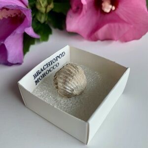 Fossilized Brachiopod Shell From Morocco Mounted Labeled and Boxed.