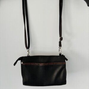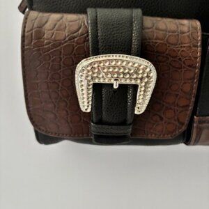 The BRACIANO Black Brown Faux Leather Buckle Silver Studded Purse Crossbody Bag is a stylish and versatile accessory for women. This small rectangular bag features a unique woven pattern and metallic finish, with silver hardware accents for a touch of edgy sophistication. The bag includes a zip closure, brown faux leather handle/strap, and multiple pockets for practicality. The exterior color combination of black, brown, and silver adds a trendy flair to any outfit, making it a must-have for fashion-forward individuals looking for a statement piece. Whimsygoth. Festival Muse. Retro Campus Core. Vintage Inspired. Subtle Glam.