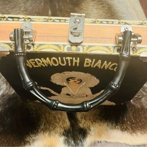 Elegant handbag with a cigar box design. Features black and silver accents. Unique handle adds charm.