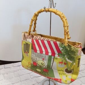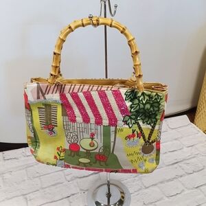 This Braciano tote bag combines vibrant pink and green hues with classic bamboo handles, offering a stylish and functional accessory for any occasion. Its structured design and spacious interior make it perfect for carrying essentials while adding a pop of color to your ensemble.